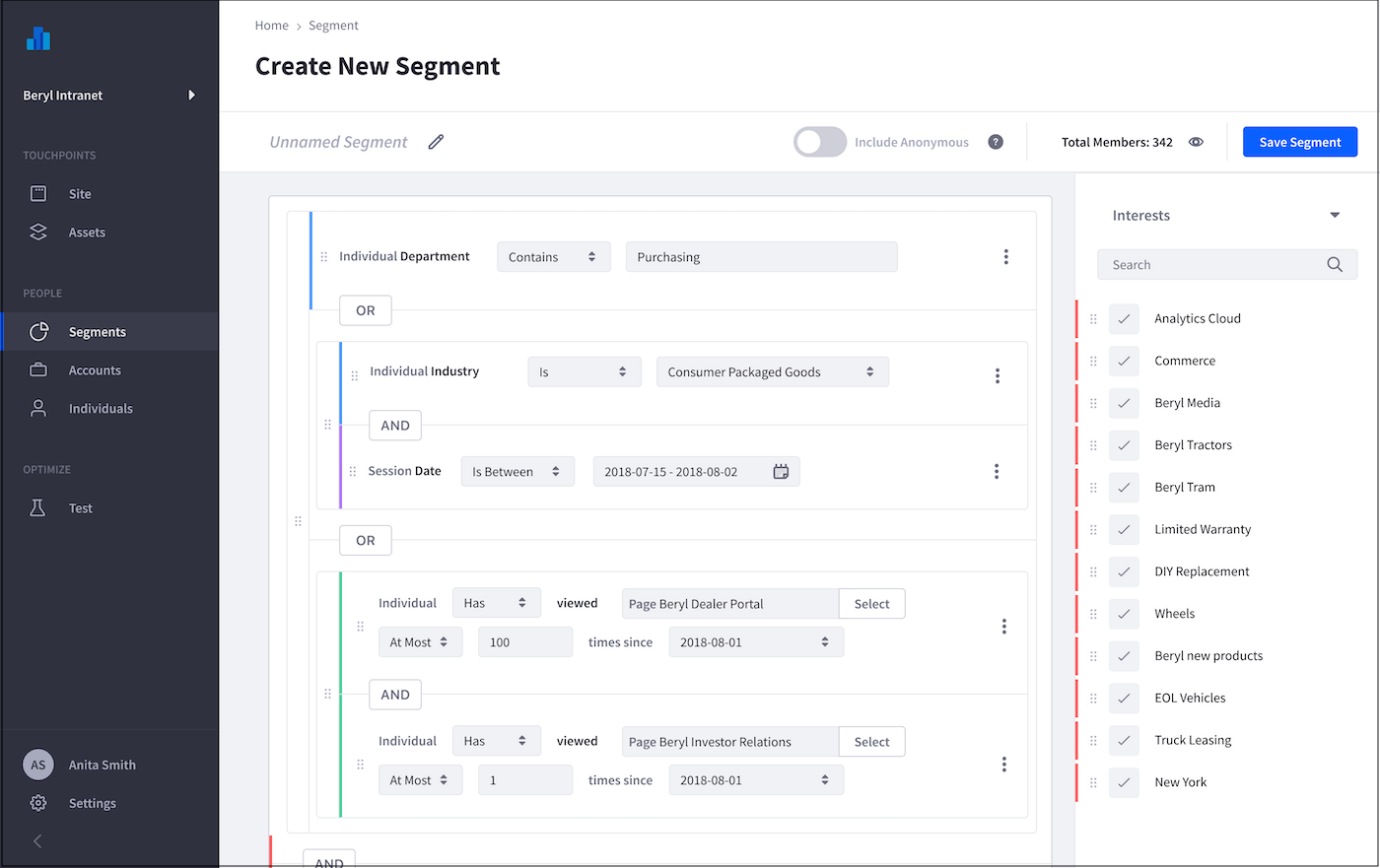 ユーザーの行動ベースでセグメントを作成することができるため、「リンクAをクリックしたユーザー」や「フォームBを閲覧したユーザー」、「製品Cのページを過去1年間に10回以上閲覧したユーザー」などの条件を基にユーザーのセグメンテーションが可能です。