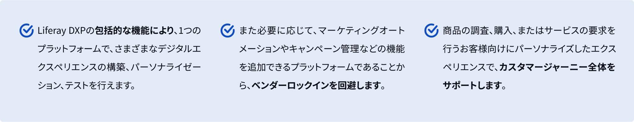 Liferay DXPの包括的な機能により、1つのプラットフォームで、さまざまなデジタルエクスペリエンスの構築、パーソナライゼーション、テストを行えます。