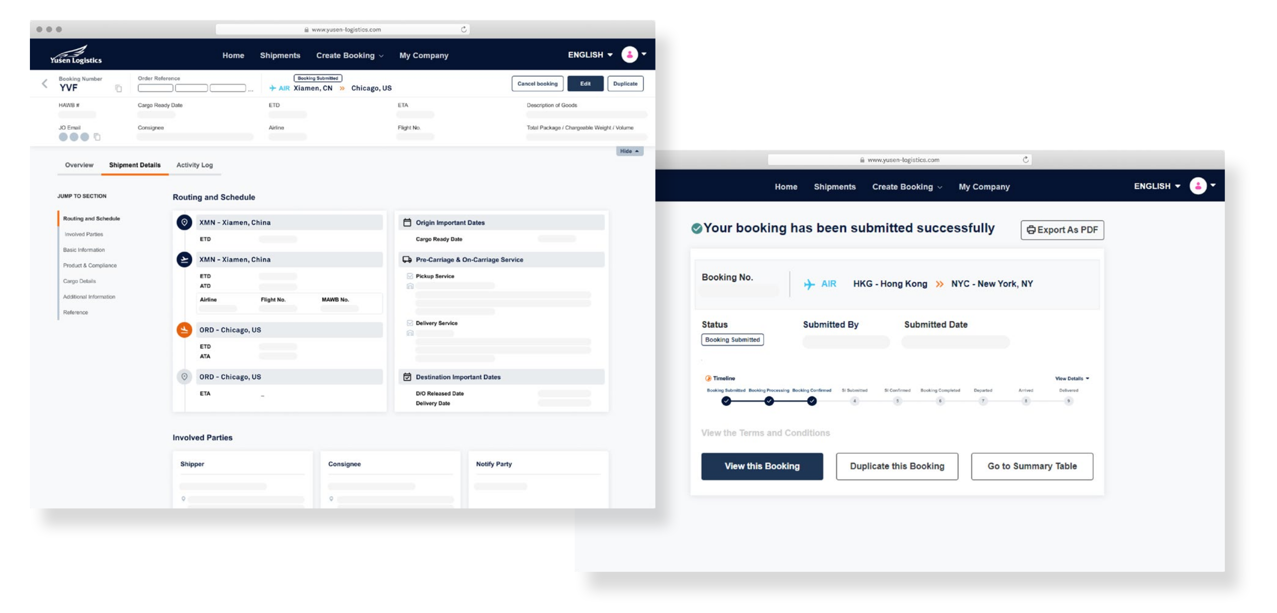 ブッキングのデジタル化:数回クリックするだけで、航空・海上貨物輸送サービスを簡単にブッキングできるため、手続きを効率化するだけでなく、手作業による事務作業が不要になります。