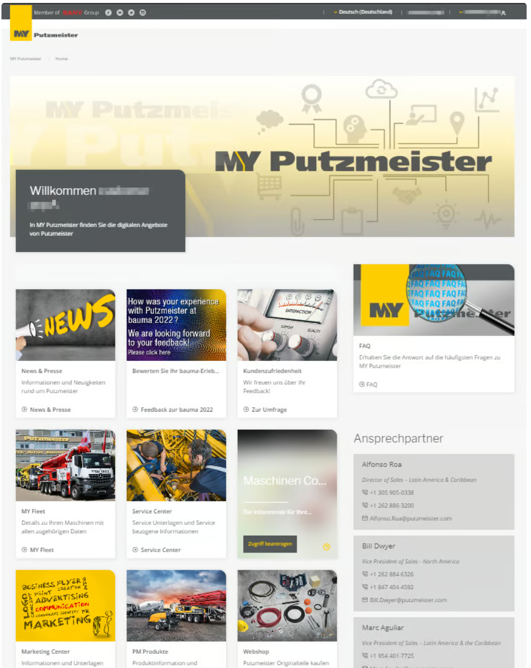 - MY Putzmeisterに対するフィードバックでは、ユーザーエクスペリエンスの向上、大幅なリソースの節約、柔軟な統合オプションが、社外ユーザー(顧客およびディーラー)および社内ユーザー(IT部門、マーケティング)の両方から熱狂的に受け入れられていることが示されました。