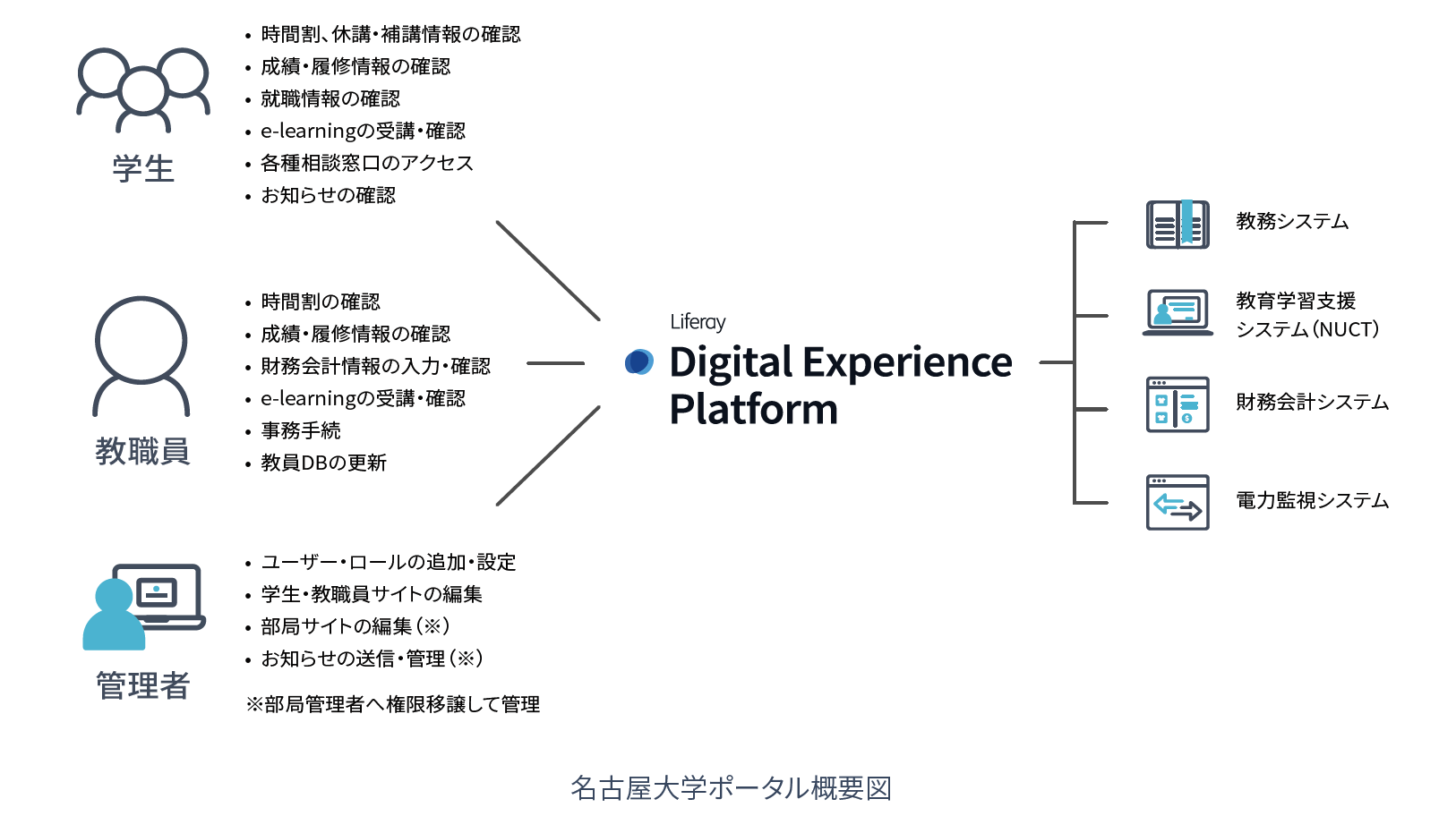 文部科学大臣より指定国立大学法人に指定された名門大学、名古屋大学は、Liferayを用いて学内ポータルを構築。マルチデバイスや多言語に対応しただけでなく、ユーザーにパーソナライズされた情報提供を行えるようになるなど、利便性が大きく向上しています。